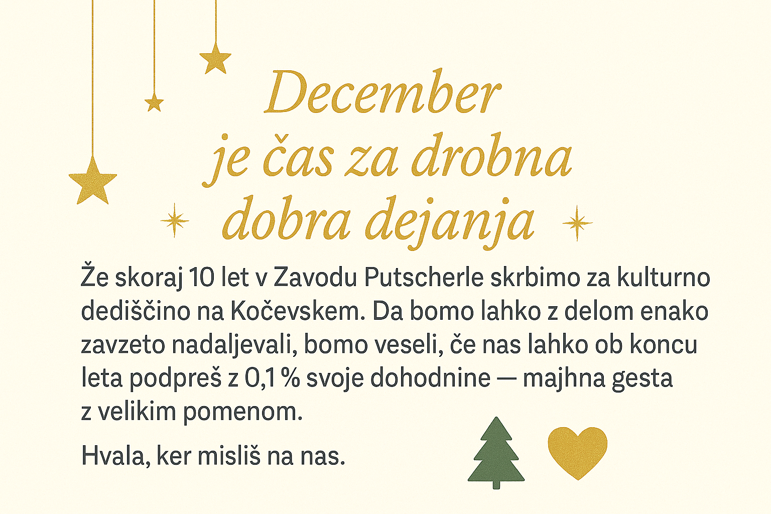 For almost 10 years, the Putscherle Institute has been taking care of cultural heritage in Kočevje. To ensure that we can continue our work with the same commitment in the future, we would be delighted if you could support us at the end of the year with 0.1% of your income tax or donation – a small gesture with a big meaning.